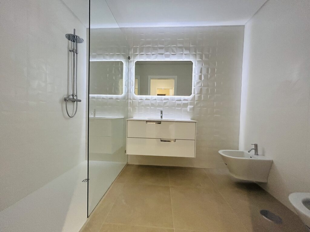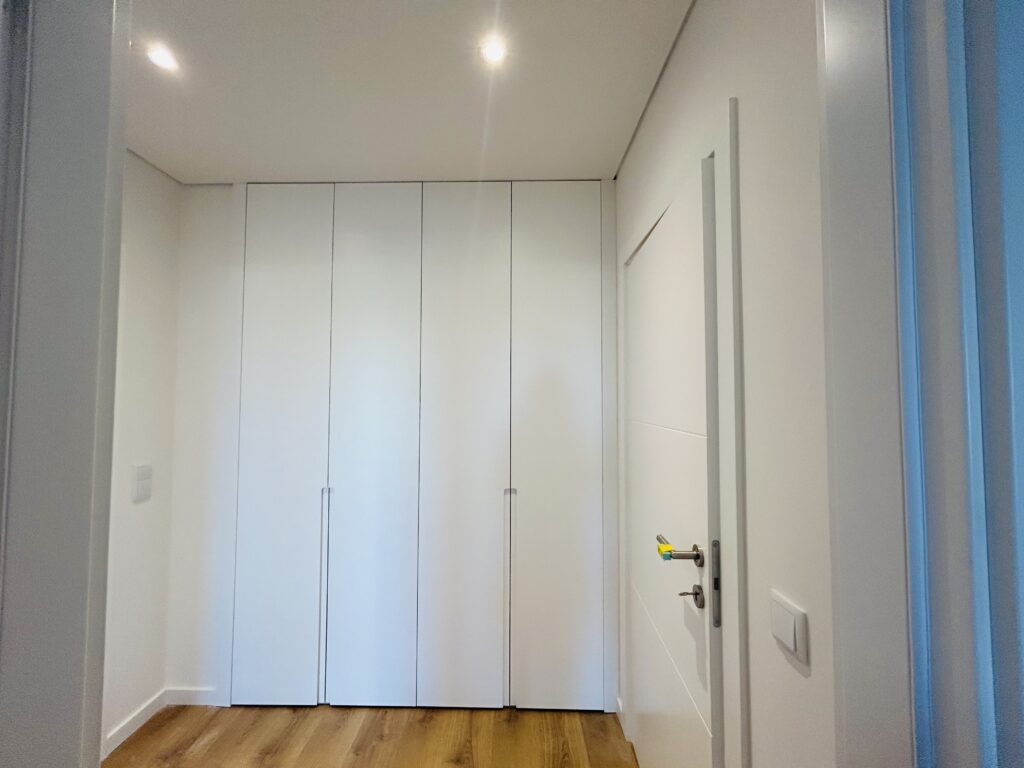 Os 3 quartos contam com roupeiros embutidos lacados a branco e luz interior, proporcionando um toque de elegância. O WC suite é um verdadeiro refúgio, equipado com poliban e resguardos em vidro temperado, além de acessórios em inox e loiças da marca Roca que garantem qualidade.
