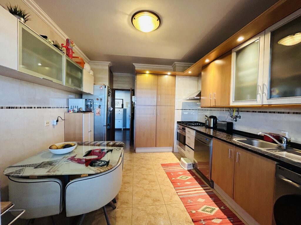 A cozinha é igualmente espaçosa, com móveis em madeira, bancadas em granito e zona de refeições. Possui ainda acesso a uma marquise fechada, que funciona como lavandaria e área de apoio.