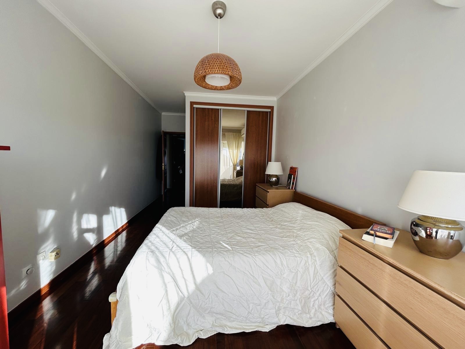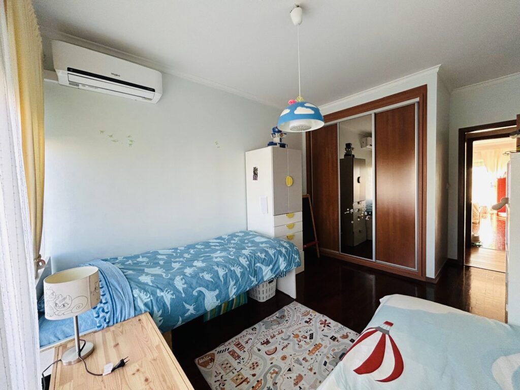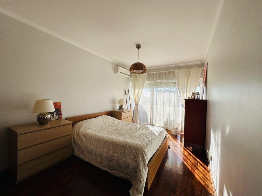 O apartamento conta com três quartos, sendo um deles suite, todos com boas áreas e roupeiros embutidos. Dispõe ainda de uma segunda casa de banho completa de apoio à zona privada. Dois destes quartos estendem-se para uma grande varanda com churrasqueira, perfeita para refeições ao ar livre.