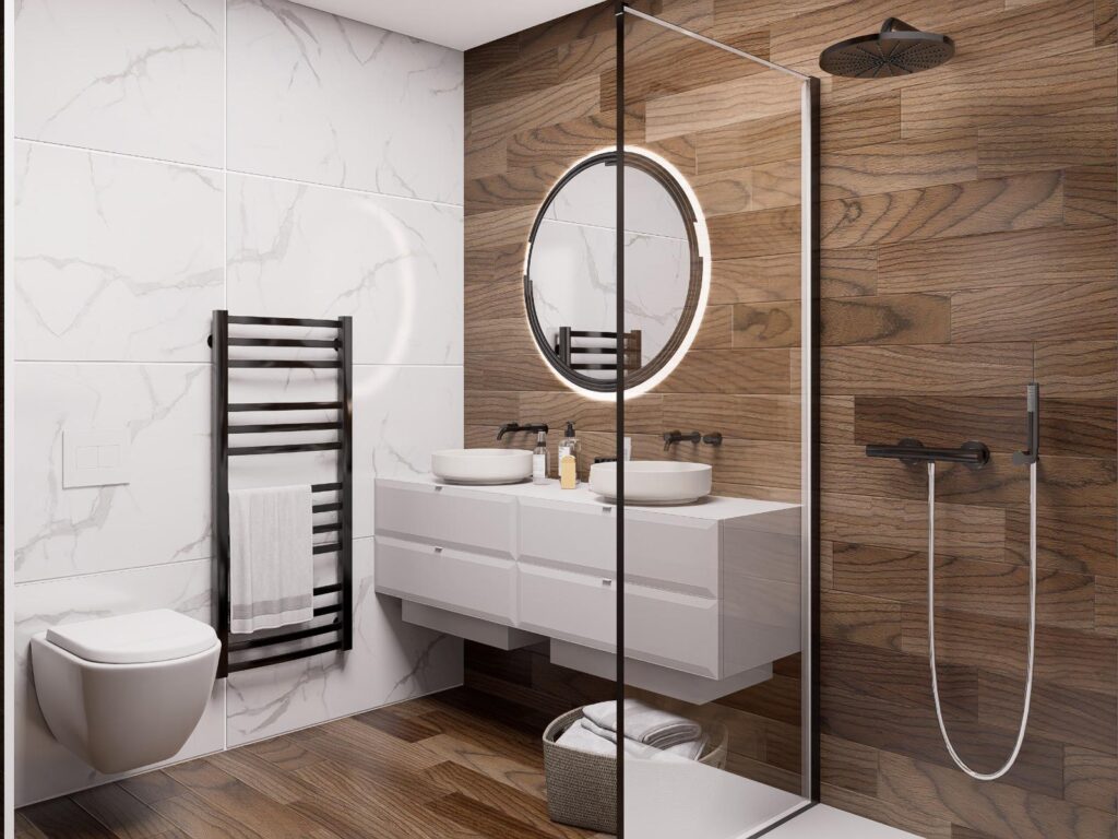 Acabamentos modernos, caixilharia em PVC com corte térmico e acústico, estores elétricos, pavimento flutuante vinilico, ou cerâmico nos wcs. As janelas são amplas mas altas o que favorece a privacidade.