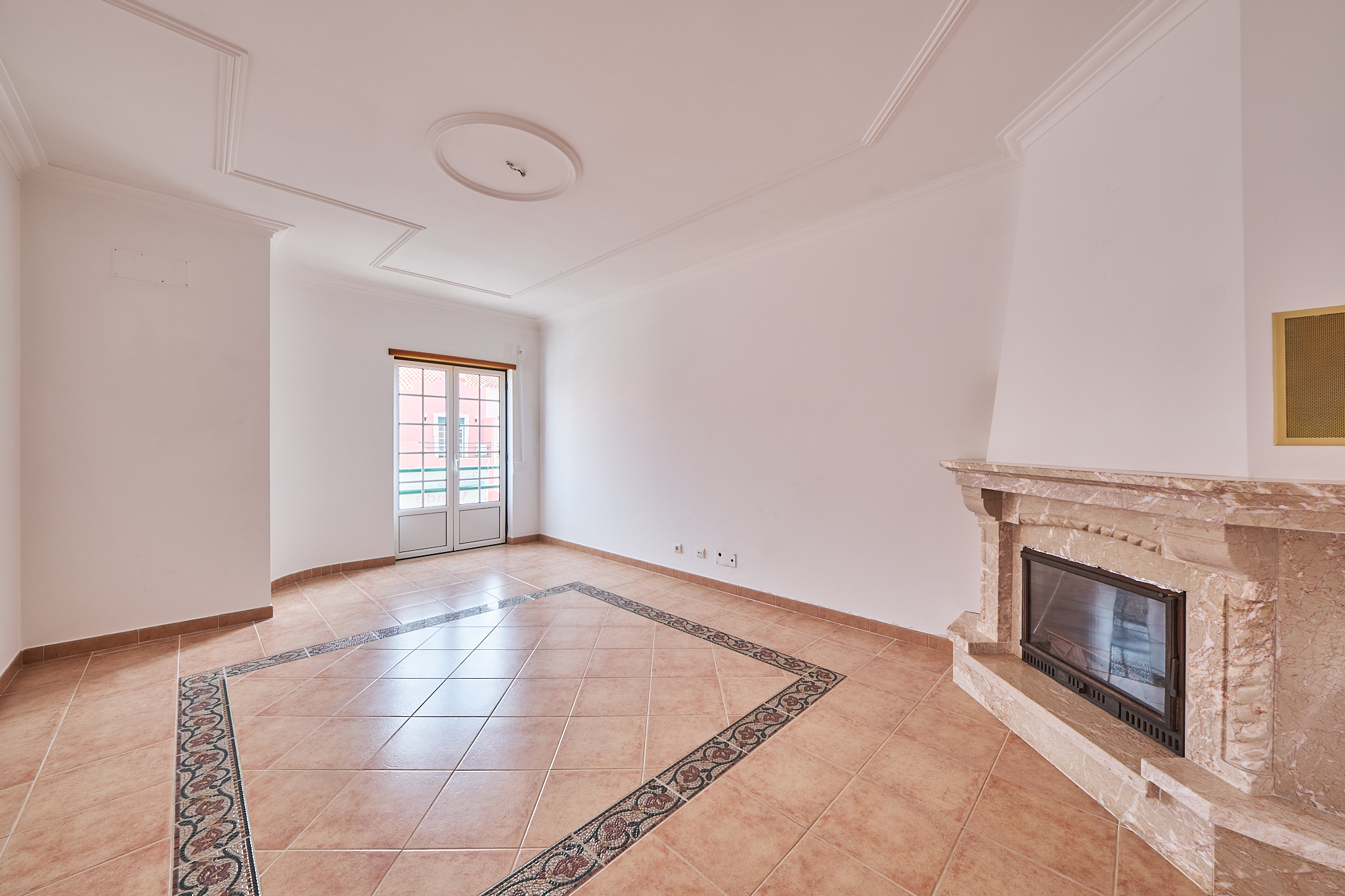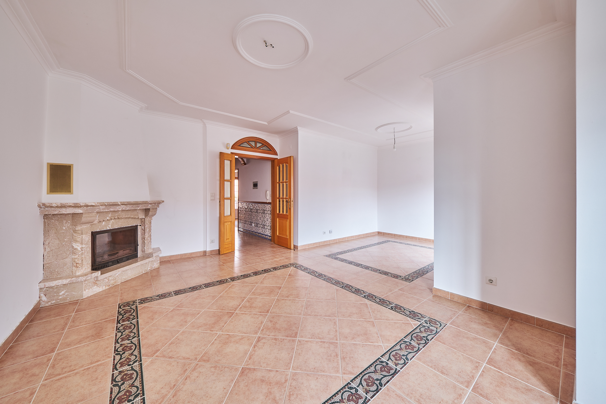 Sala espaçosa com lareira.